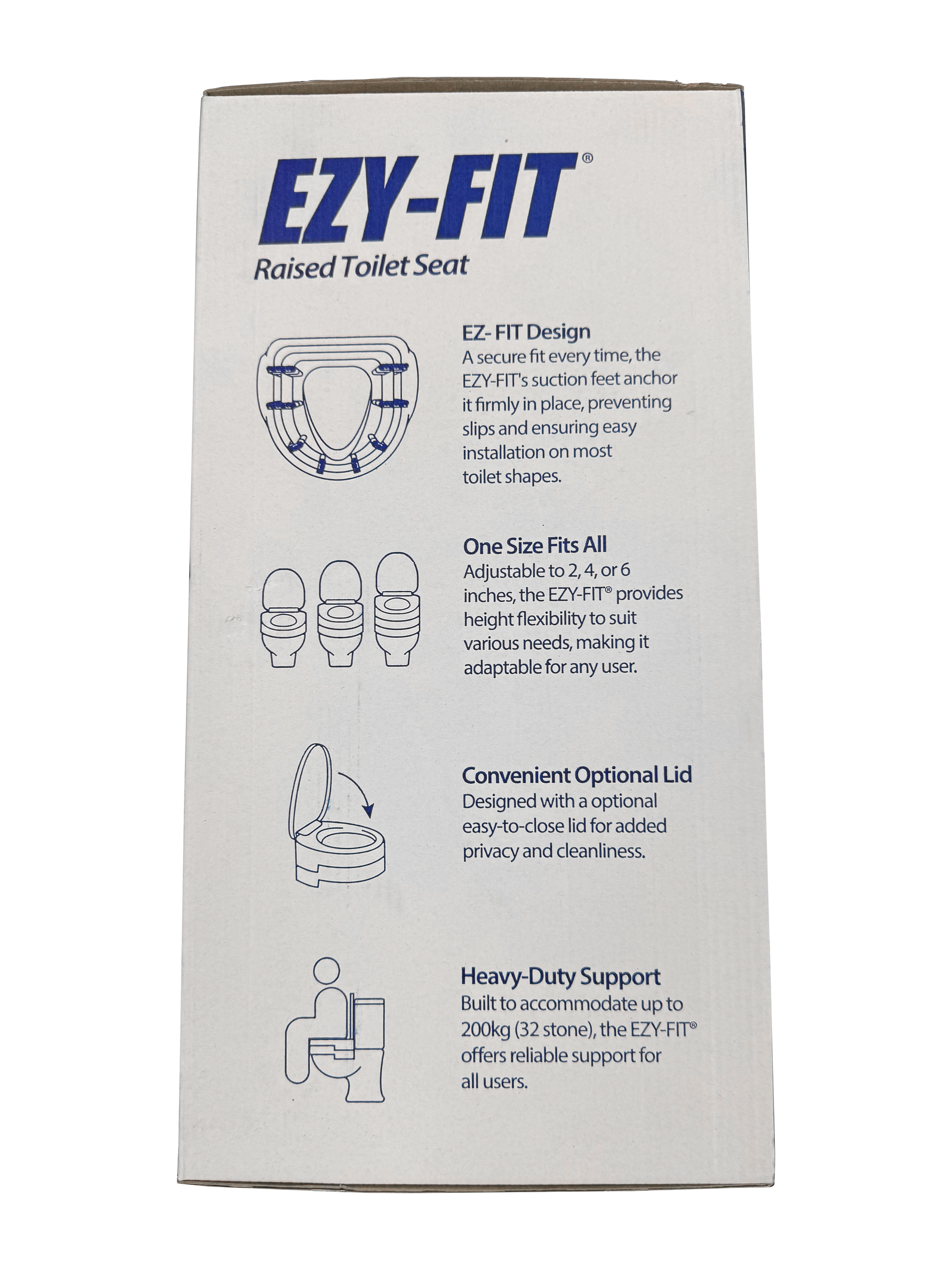 By reducing the need to bend, it helps take the strain off your hips and knees, while the strong, secure design supports up to 200 kg (31 stone). With suction feet for quick, tool-free fitting, it attaches firmly to most toilet shapes (round, oval, or square) so you can feel confident every time you use it. Finished with a smooth, easy-to-clean surface and an optional lid, the EZY-FIT® blends seamlessly into your bathroom while giving you reliable support day after day.